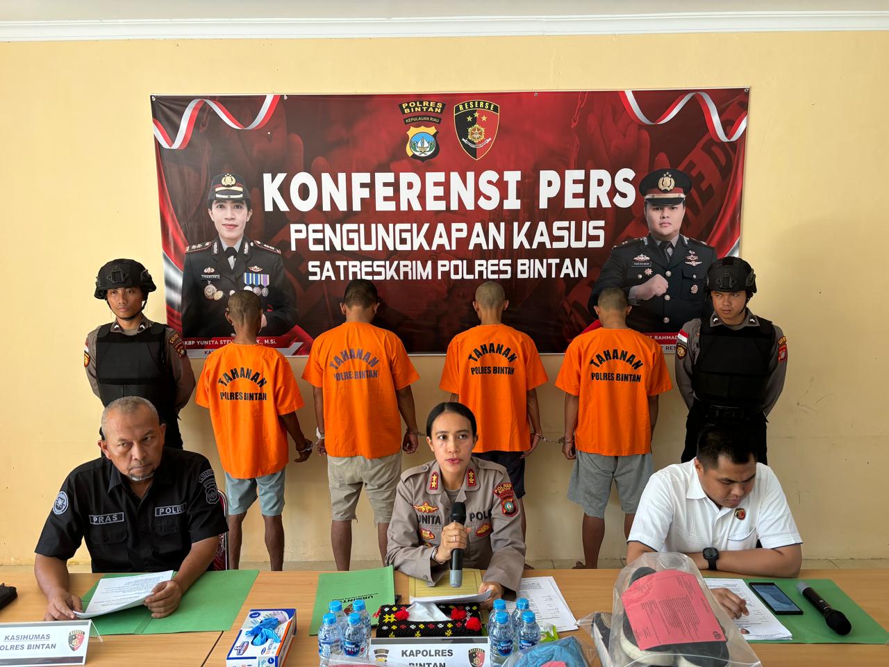 Kegiatan Konferensi Pers yang dipimpin langsung oleh Kapolres Bintan, AKBP Yunita, Stevani, SIK, M.Si didampingi Kasatreskrim Polres Bintan, Kasihumas dan Kanit 1 Satreskrim Polres Bintan serta para insan pers Kabupaten Bintan dan Tanjungpinang yang dilaksanakan di Lobi Satreskrim Polres Bintan pada Senin (19/5/2025).