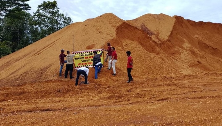 Warga saat Memasang Spanduk Larangan Untuk Lakukan Loading/ Pengangkutan Stockpile Bauksit PT. Hermina Jaya. (Ft: Ist)