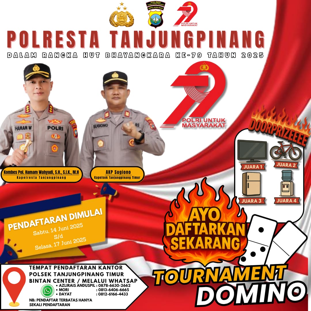 TANJUNGPINANG, Kepritoday.id – Dalam rangka menyambut Hari Ulang Tahun (HUT) Bhayangkara ke-79 yang jatuh pada 1 Juli 2025, Polresta Tanjungpinang akan menggelar turnamen domino terbuka untuk masyarakat.