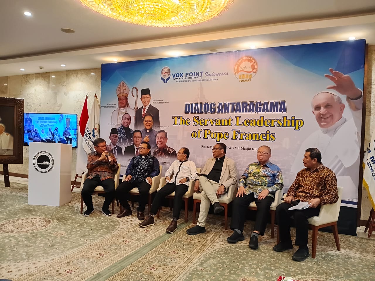 JAKARTA, Kepritoday.id – Vox Point Indonesia menggelar Dialog Antaragama bertema “Kepemimpinan Hamba Paus Fransiskus” di Masjid Istiqlal, Rabu (28/5). Menteri Agama Republik Indonesia, Prof. KH Nasaruddin Umar, MA, hadir mendoakan forum dialog antar agama ini sekaligus menjadi keynot speaker.